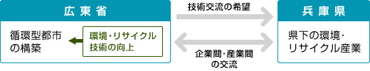 兵庫県、広東省経済貿易委員会、日本貿易振興機構JETRO広州事務所などと連携して、ビジネスマッチング会を開催しました。ねらいは、兵庫県と広東省、両県省産業間の交流により、広東省の環境・リサイクル技術の向上、ひいては循環型都市構築の推進を図ることです。